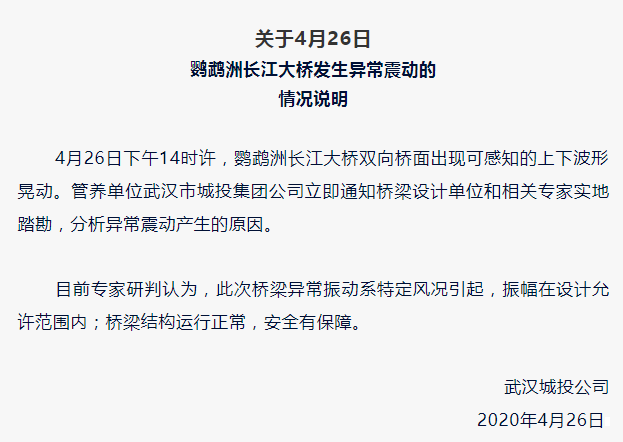 该桥管养单位武汉市城投集团公司回应称,此次桥梁异常振动系特定风况引起,振幅在设计允许范围内;桥梁结构运行正常,安全有保障。